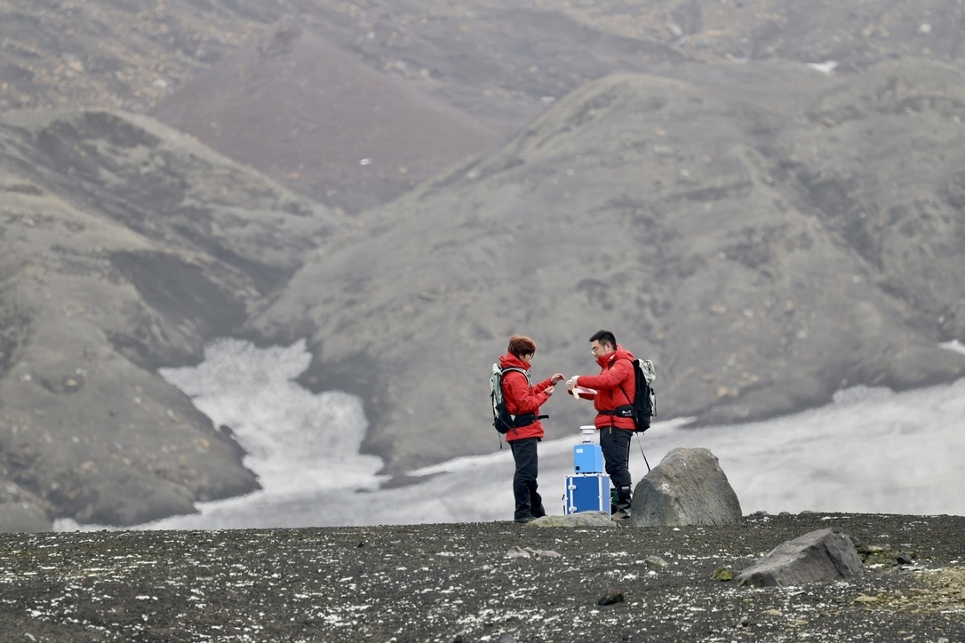在南极欺骗岛,为了采集山顶土壤样品,师生两人迎着寒风往高处爬,为了保证无菌操作,只能戴着很薄的无菌手套开展工作,采完样之后,两人的手几乎冻僵,但还不能停下,需背着几十公斤的样品翻越山坡返回科考船。